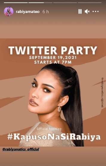 On Saturday, Rabiya shared via an Instagram story a fanpage’s post encouraging fans to join the Twitter party for the Iloilo beauty on Sunday, using the the official hashtag #KapusoNaSiRabiya.