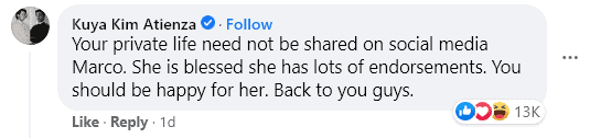 “Your private life need not be shared on social media Marco. She is blessed (that) she has lots of endorsements. You should be happy for her. Back to you guys,” Kuya Kim wrote in the comments section of a story published on PEP’s Facebook page.