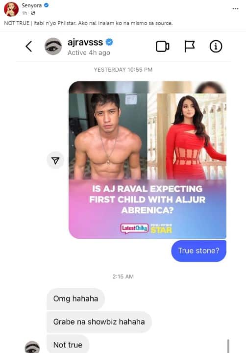 “Omg hahaha. Grabe na showbiz hahaha. Not true,” AJ wrote in reaction to a graphic posted by The Philippine STAR’s LatestChika.