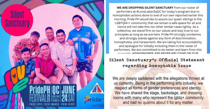 Pride PH announced its removal of local rock band Silent Sanctuary from the roster of performers for the annual Pride March event, Love Laban sa QC, in Quezon City on Friday, June 24, due to allegations of homophobic actions.