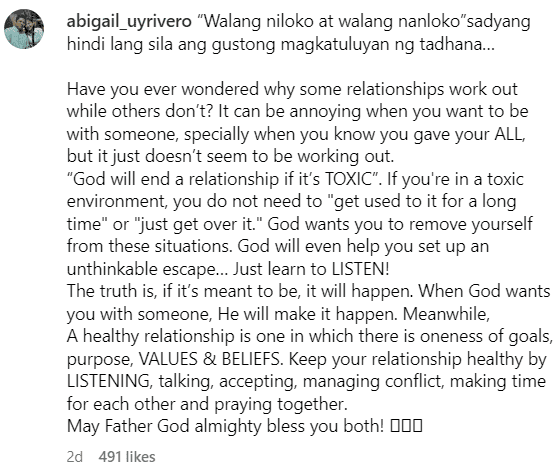 “’Walang niloko at walang nanloko'[,] sadyang hindi lang sila ang gustong magkatuluyan ng tadhana,” Abigail began.