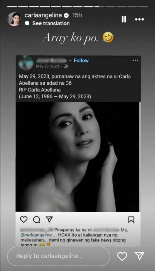 This was Kapuso actress Carla Abellana’s reaction to the fake news of her death made by a netizen on Facebook.