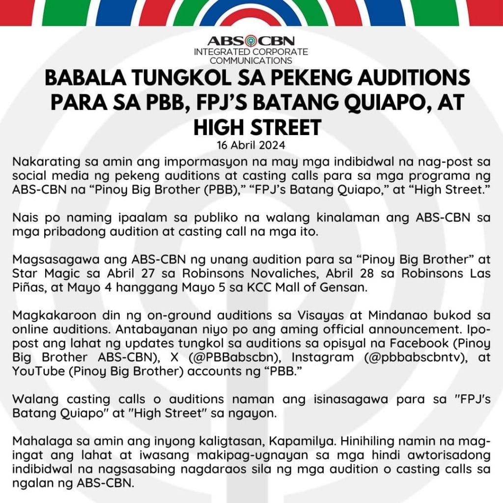 In the official statement dated April 16, the Kapamilya network stated, “Nakarating sa amin ang impormasyon na may mga indibidwal na nag-post sa social media ng pekeng auditions at casting calls para sa mga programa ng ABS-CBN na Pinoy Big Brother (PBB), FPJ’s Batang Quiapo, at High Street.”