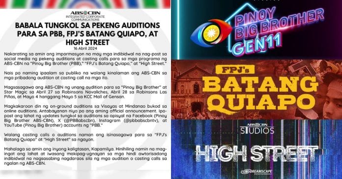 ABS-CBN has officially released its statement after receiving reports of scammers posting fake auditions and casting calls for its programs, including FPJ’s Batang Quiapo, Pinoy Big Brother, and High Street.