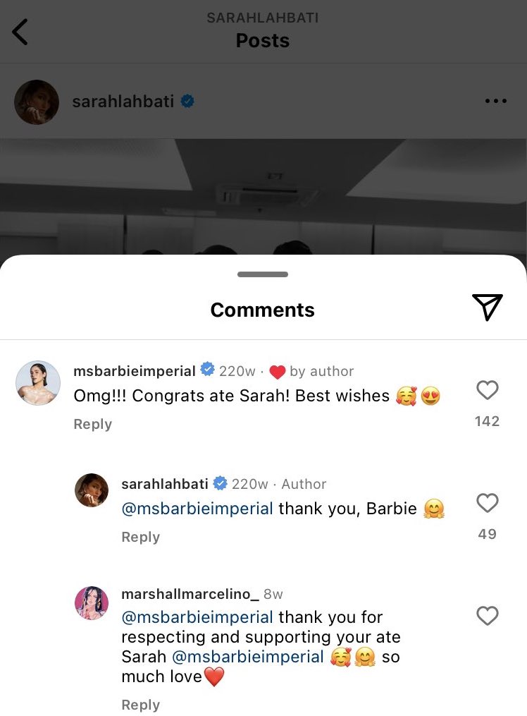 However, what caught netizens’ attention was Barbie’s comment which read, “Omg!!! Congrats ate Sarah! Best wishes”