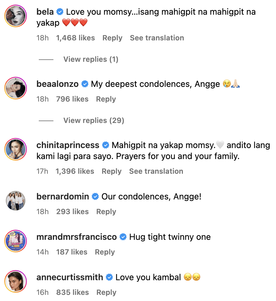 Celebrity friends of Panganiban were quick to express their condolences following the news of her mother’s passing.