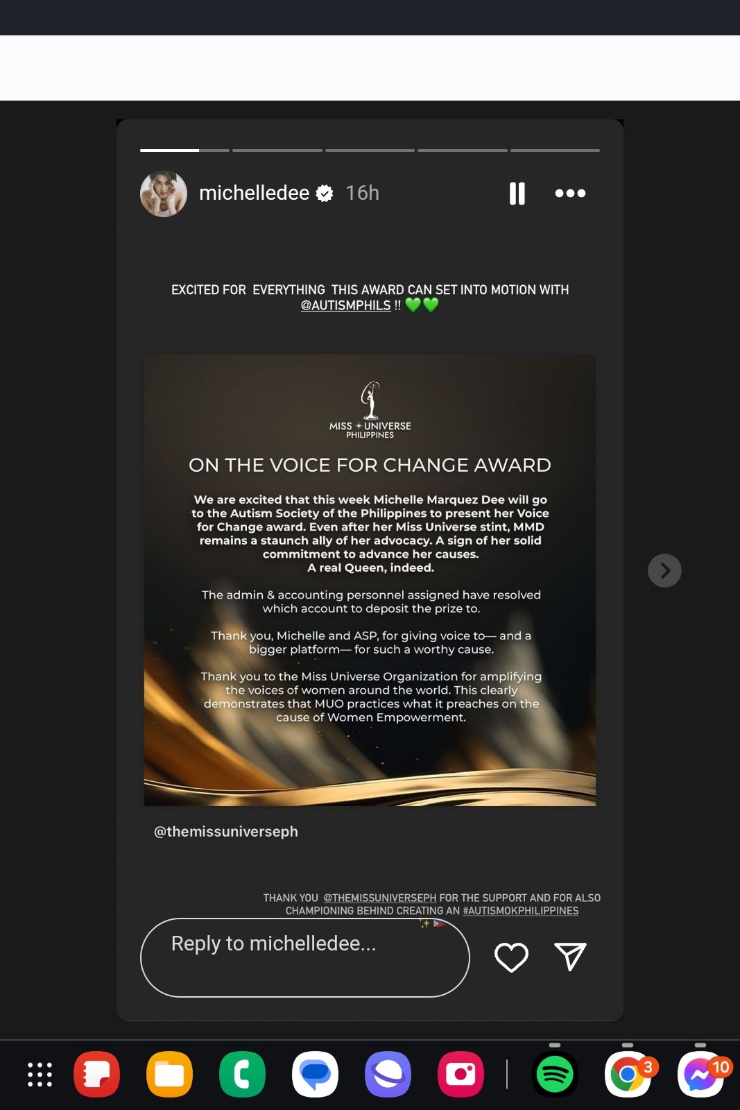 “We are excited that this week Michelle Marquez Dee will go to the Autism Society of the Philippines to present her Voice for Change award. Even after her Miss Universe stint, MMD remains a staunch ally of her advocacy,” MUPH said in a statement.