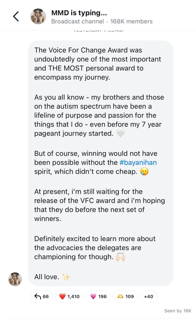 In response to Dee’s post, the Miss Universe Philippines (MUPH) Organization issued a statement on Tuesday, explaining the situation and confirming that the prize money will finally be given to the Autism Society Philippines within the week.