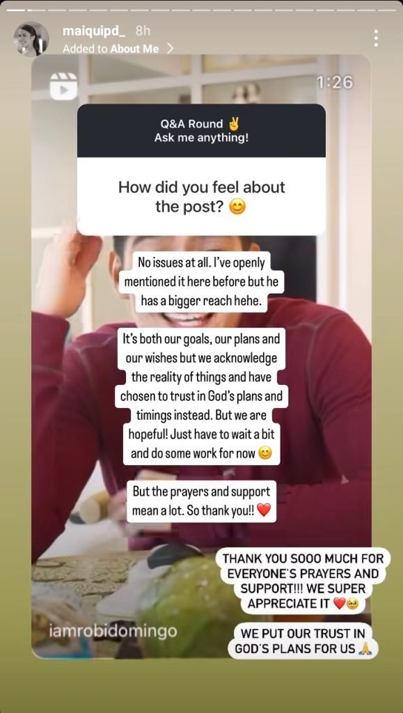 In response to a question about her reaction to Robi’s birthday post, she wrote, “No issues at all. […] It’s both our goals, our plans and our wishes but we acknowledge the reality of things and have chosen to trust in God’s plans and timings instead.