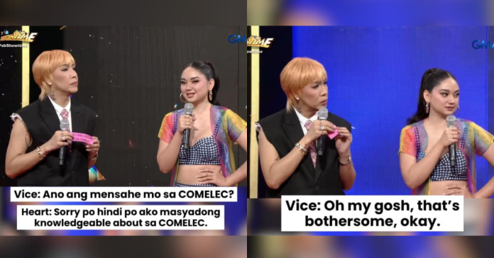 The viral moment occurred during the noontime program’s “Sexy Babe” segment, when Vice Ganda asked a 20-year-old contestant identified as Heart Aquino, about her message to the COMELEC.