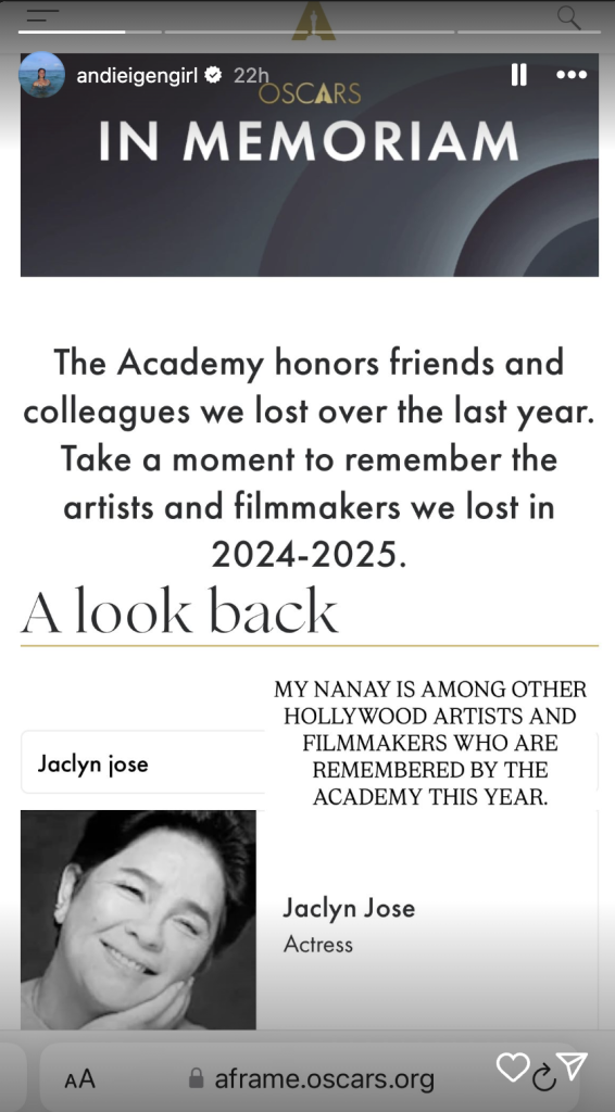 “My nanay is among other Hollywood artists and filmmakers who are remembered by The Academy this year,” she wrote, sharing a screenshot of the tribute.