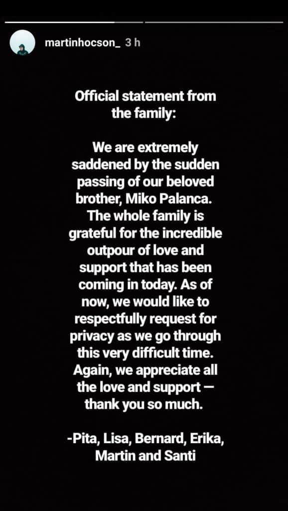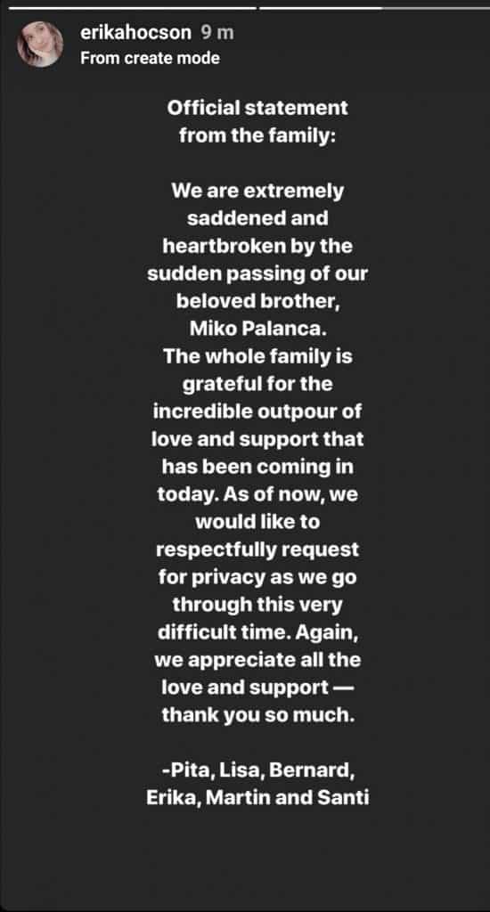 “We are extremely saddened and heartbroken by the sudden passing of our beloved brother, Miko Palanca. The whole family is grateful for the incredible outpour of love and support that has been coming in today,” said the family statement posted by Miko’s younger siblings Erika and Martin Hocson on their Instagram stories early Tuesday.