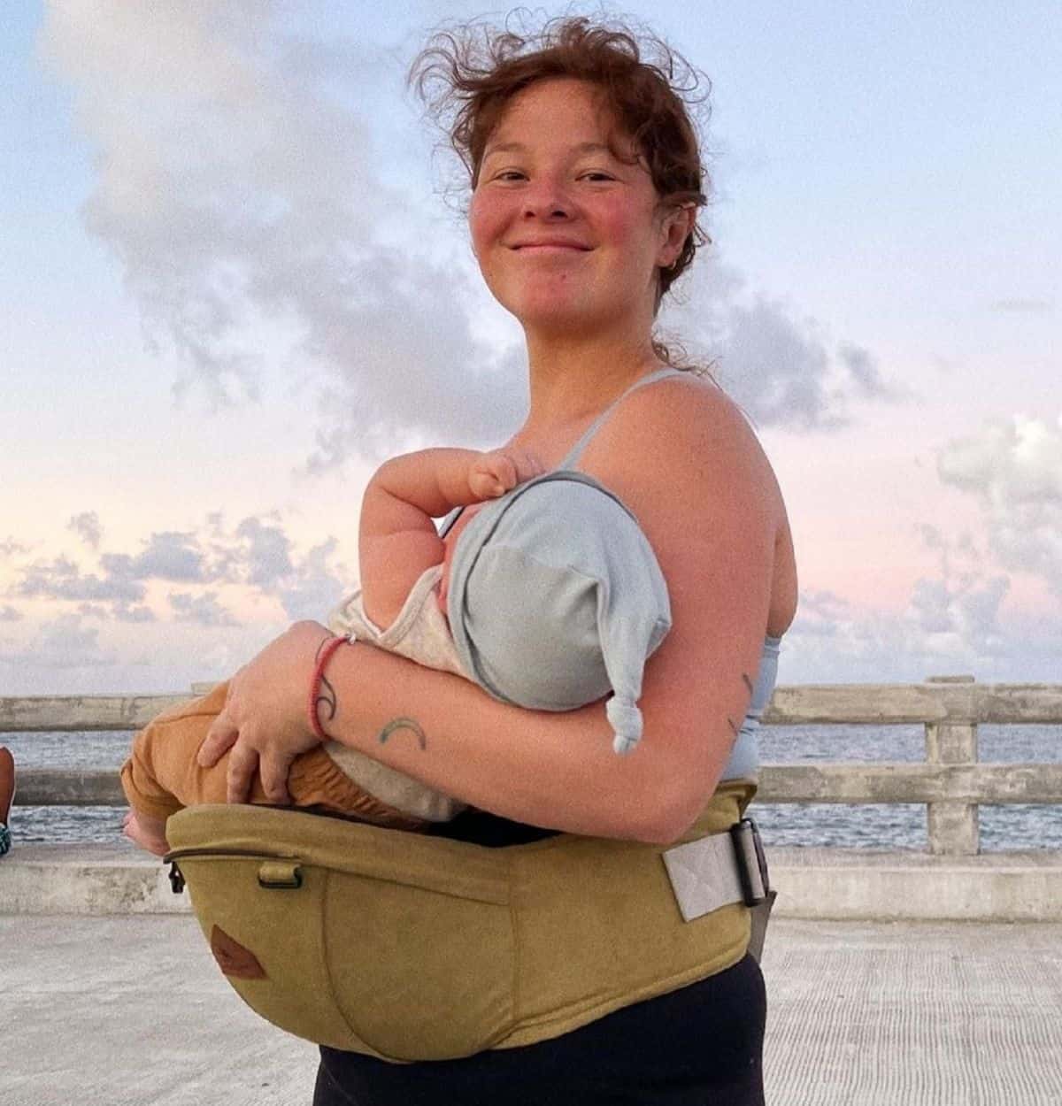 In the photo, she sported a tank top and bicycle shorts with a baby carrier around her waist as she cradled her baby boy Koa.
